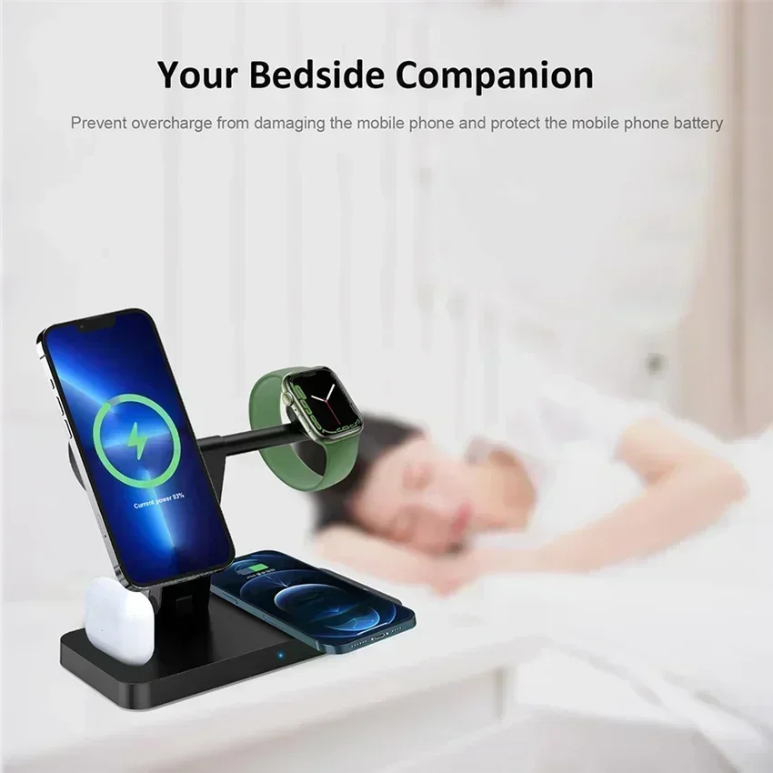 【4 in 1 Magnetic Wireless Charger】: The 4 in 1 Wireless Charging Station with Apple MagSafe Charger for Multiple Devices.The magnetic wireless charger has built-in premium magnets,super suction.The magnetic charging stand can precisely align the best wireless charging position of your device, it can charge 4 devices at the same time.